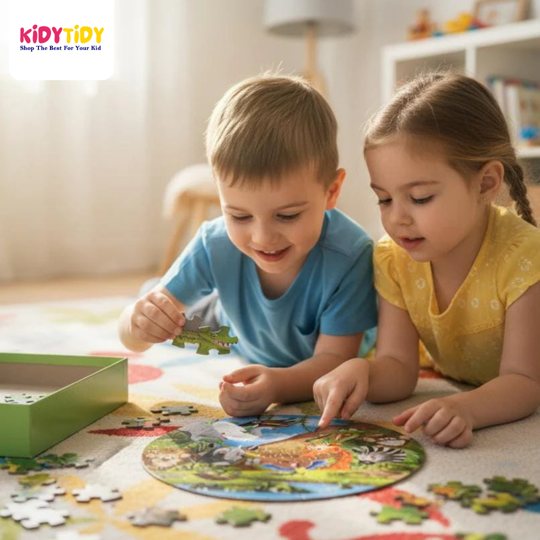 With 128 durable puzzle pieces, it’s the perfect challenge for young learners who love animals and adventure. Once completed, the round puzzle (size: 420mm x 438mm) reveals a vibrant jungle party scene that kids will be proud to display.