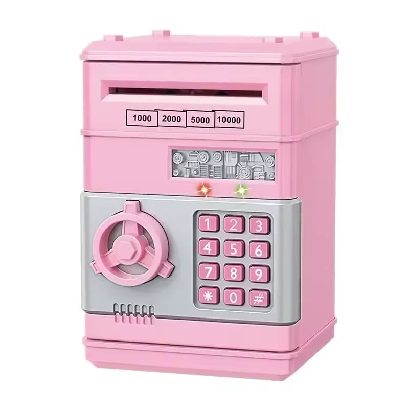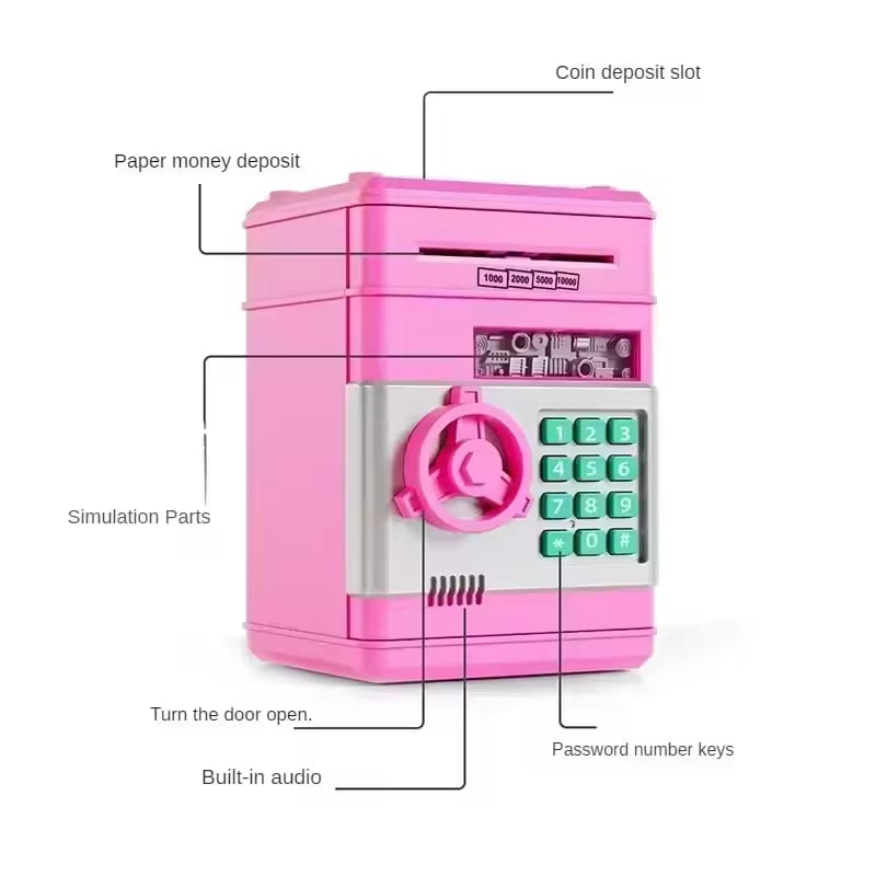 A secure and fun way for children to save! This bright pink electronic piggy bank is designed like a miniature safe, providing a cool and realistic saving experience.