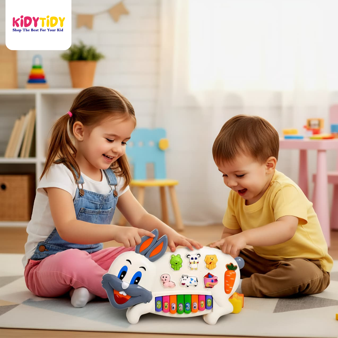 Make learning fun with the Musical Bunny Animal Sound Toy! Shaped like an adorable bunny, this interactive toy features colorful piano keys, cute animal buttons, and engaging sound effects. Kids can press the animal buttons to hear their unique sounds or play simple tunes on the piano keys, combining music and learning in one delightful toy.